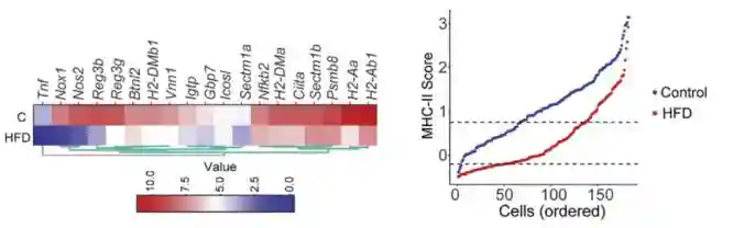 细胞发生或即将发生的变化,基因作为掌控者最有发言权。于是研究员们分别从对照组和HFD饲养的小鼠身上分离得到了Lgr5+ISCs,并依次对其进行了mRNA测序和单细胞RNA测序。他们发现,对照组ISCs中的H2-Ab1水平是HFD组的3倍多,而H2-Ab1是MHCII类复合体的关键成分,那是否意味着MHCII的水平在HFD处理后也会降低?之后的结果分析证实了这一点,与对照组相比,HFD组中MHCII分子的表达确实有所下调。