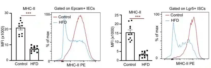 有了基因水平的预判,Beyaz团队又通过流式分析发现,在稳定状态下,Epcam+肠上皮细胞(Epcam+IECs)和Lgr5+ISCs的细胞表面均会表达高水平的MHCII类蛋白,可一旦经过HFD处理,二者表面MHCII都会显著下调。