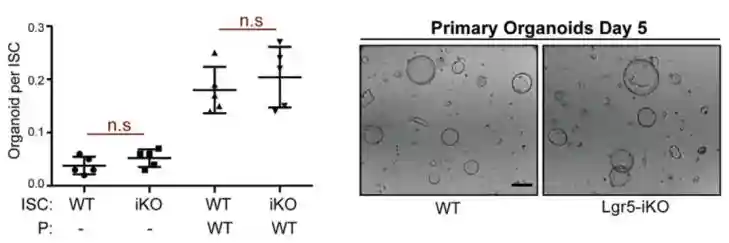 前面提过,ISCs对维持肠道适应性极其重要,而且还是肠壁各种特殊细胞的“造物主”,所以在证实高脂饮食影响ISCs表面MHCII表达以后,他们立刻对其功能做了评价,结果却出人意料,Lgr5+ISCs及其子代中MHCII蛋白的缺失并不影响ISCs的增殖或类器官形成能力。