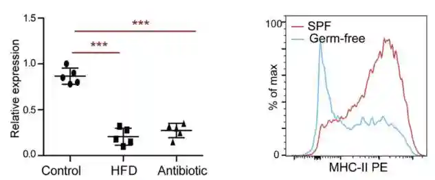 通过对无菌小鼠进行粪便移植,他们再次证实了螺杆菌定植与肠道上皮组织中MHCII分子表达水平相关。以上结果表明,肠上皮组织中MHCII表达受肠道共生菌群的调节,而HFD正是抑制这种良性的调控才会诱发MHCII表达下调。