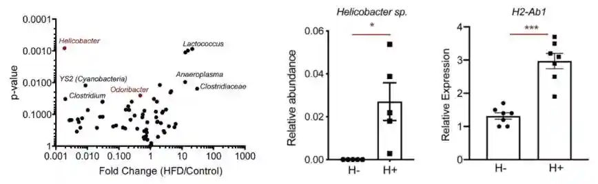 接着他们在不同环境下饲养小鼠,分别是螺杆菌自然定植的脏房间(H+)和无螺杆菌定植(H-)的清洁房间,结果显示,螺杆菌细菌在H+小鼠中更丰富,并且与MHCII分子的高水平表达相关。