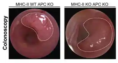 为了证明,研究员们将三苯氧胺诱导抑癌基因APC失活的ISCs(Apc)移植到MHCII敲除或不敲除的小鼠体内,观察小鼠的肿瘤发生,结果显示,与野生型小鼠相比,MHCII敲除小鼠发生肿瘤的比例更高、体积更大。