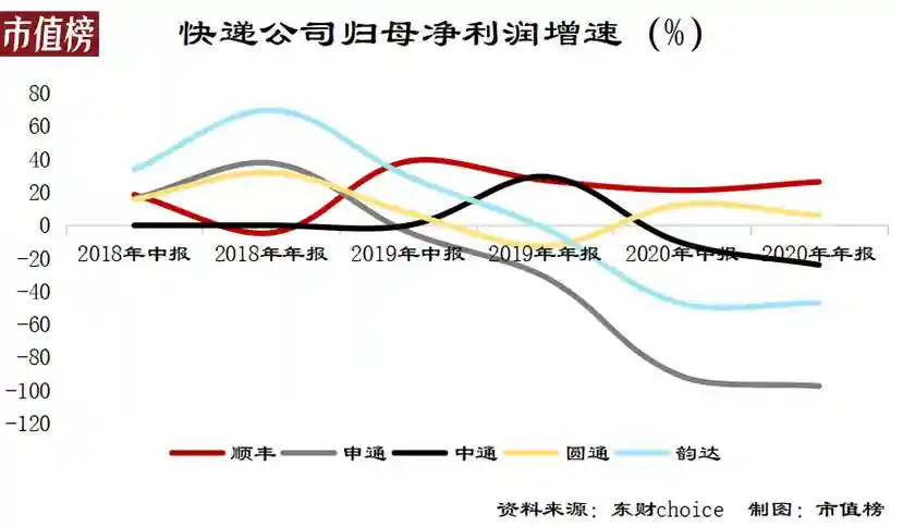 2020年快递行业增速31%,中通、韵达、申通作为电商快递高景气度的直接受益者,在业务量维持高增长的情况下,盈利却出现负增长,只有圆通勉强维持住了6%的归母净利润增长。