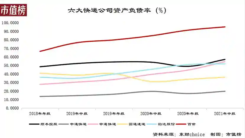 尤其是百世快递,2021年半年报的资产负债率已经超过95%,距离资不抵债也不远了。