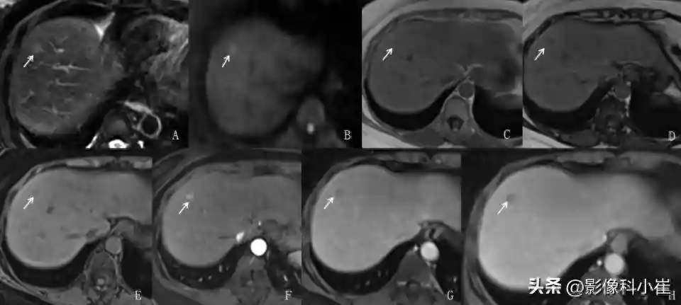 MRI上HCC分型与病理分型相同,病灶T1WI为略低或等信号,瘤内脂肪变性、出血、坏死囊变时信号不均,脂肪变性是HCC的特征之一,可利用同反相位显示该特点;T2WI呈略高信号,T2WI-FS显示更清晰;边界清晰或不清,DWI及ADC示弥散受限。增强扫描动脉期明显强化呈相对高信号,静脉期强化程度迅速下降,呈略低信号,平衡期强化程度继续下降呈低信号,总体呈“快进快出”强化方式。肝胆特异期呈低信号。