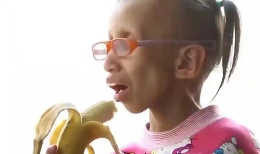 如今的桐桐身体健康了许多,因为她特别怕光,父母专门为她买了一副眼镜给她戴上,桐桐终于可以像别的孩子一样外出打闹了。