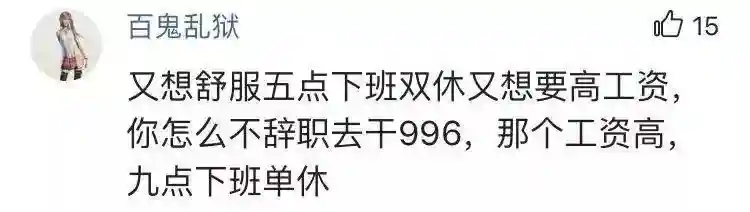 “又想舒服五点下班双休又想要高工资,你怎么不辞职去干996?”