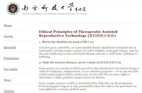 南方科技大学贺建奎实验室的网页则列举了五项“核心价值观”,其中也提到该团队“不会牺牲孩子的未来福祉和自由意志”,也不会参与“基因提升、美化外貌、性别筛选”等活动。