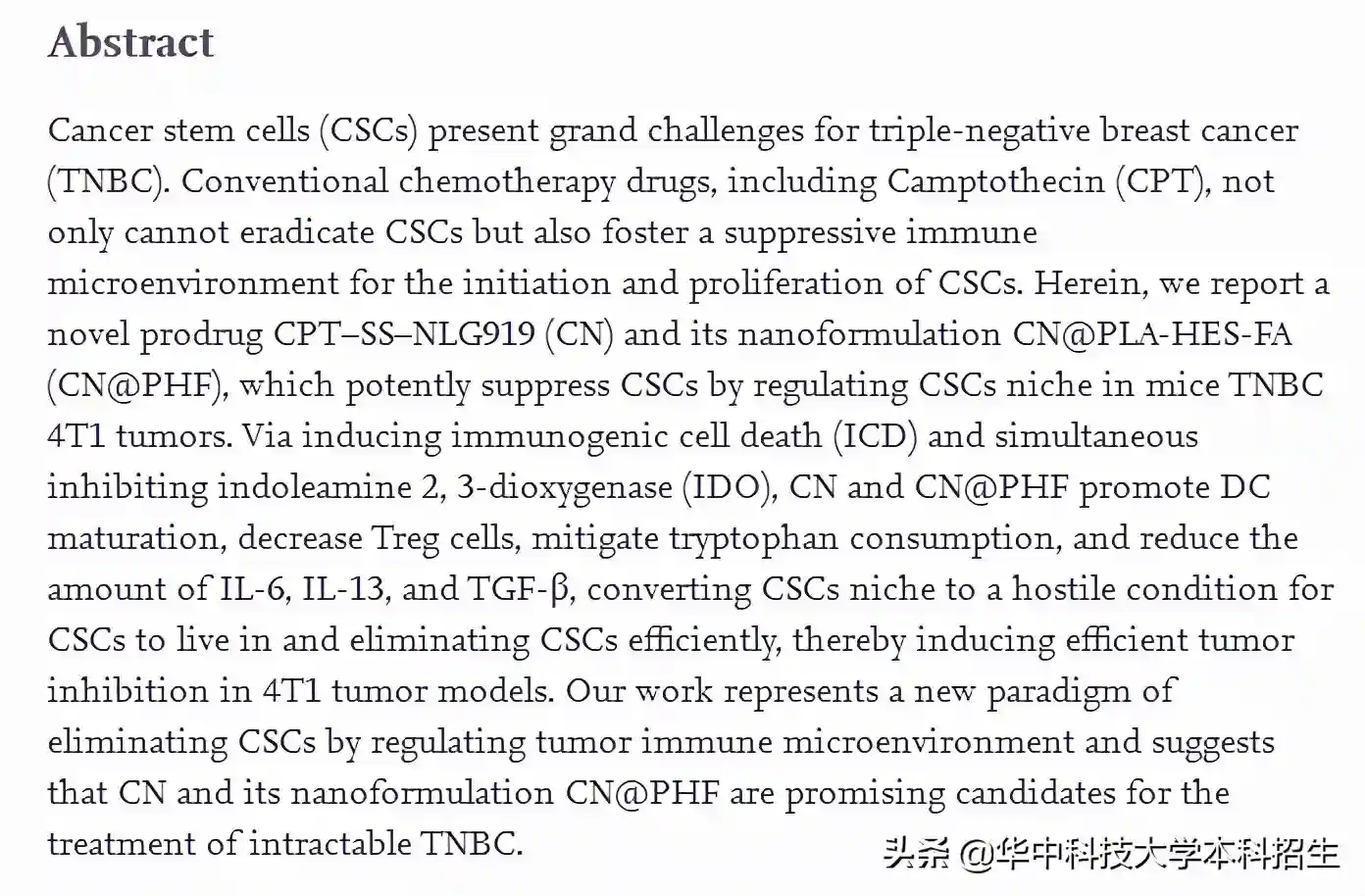 本研究通过结合免疫原性细胞死亡和抑制吲哚胺-2,3-加氧酶,改善肿瘤干细胞小境,解除干细胞休眠从而清除肿瘤干细胞,对杀伤肿瘤干细胞相关研究具有重要指导意义。本研究系统评价了前药分子CN及其纳米制剂的抗肿瘤活性,毒性以及最佳给药剂量。该前药分子CN及其纳米制剂已获得中国授权专利,并具有良好的临床转化前景。