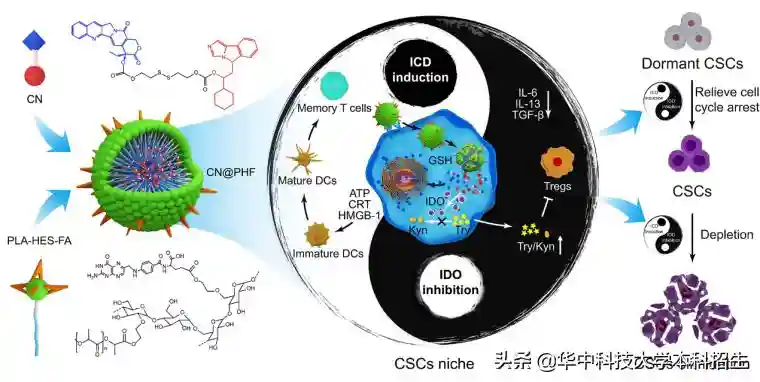 恶性肿瘤已成为我国居民的第一位死亡原因,严重威胁国民健康。其中,肿瘤干细胞是阻碍恶性肿瘤治疗的主要障碍,临床数据显示大部分肿瘤中含有肿瘤干细胞。化疗药物是目前治疗各种肿瘤的主要手段,但传统的化疗药物不仅不能有效地杀伤肿瘤干细胞,还会增加肿瘤细胞的干性同时诱导肿瘤干细胞进入休眠,降低其对药物和免疫细胞的响应。此外,肿瘤内部免疫抑制性微环境通过免疫细胞、细胞因子、氨基酸等营造了一个适合肿瘤干细胞生长、增殖的肿瘤干细胞小境。如何有效地清除肿瘤干细胞是临床肿瘤治疗中亟需解决的重要问题。