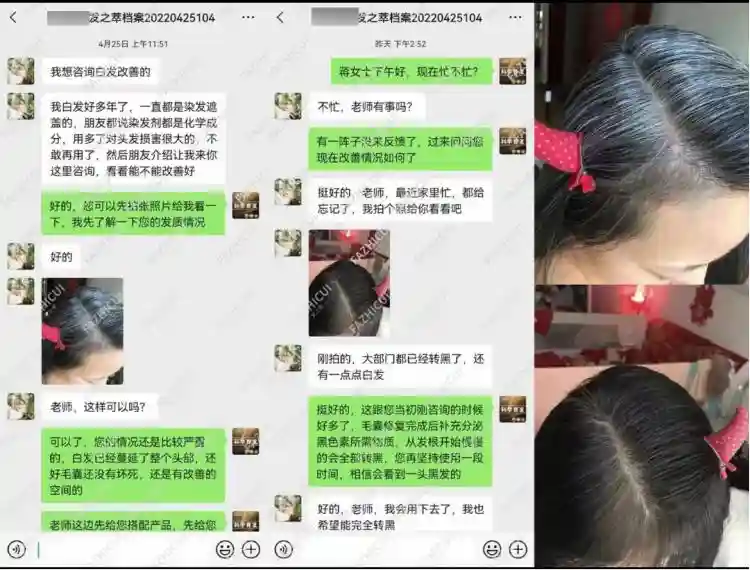 行动当天,专案组根据团伙销售记录联系到被害人王女士。王女士于去年12月在网上看到该团伙投放的生发广告,根据广告添加了昵称为“发之萃——首席育发指导老师”的客服微信。对方向其展示了产品专利、导师资格证等信息,还发了几张其他使用者的效果图。于是王女士购买对方介绍的200元的试用产品使用一周后,“指导老师”又称需要巩固效果,继续向其推销了一款2000元的防脱发产品。王女士用完两个疗程后,发现完全没有效果,向对方询问,对方仅向其推销其他疗程。直到接到民警电话,王女士才明白自己被骗。