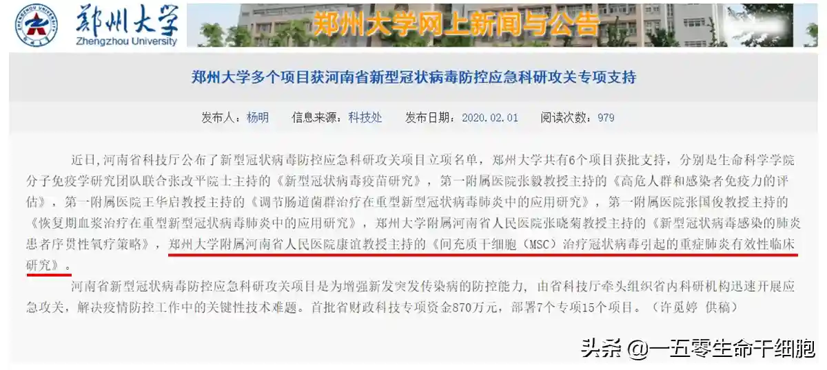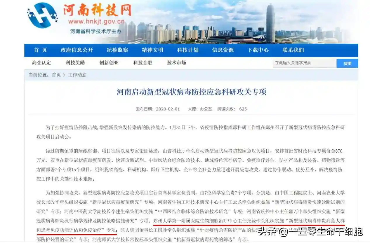 2020年2月1日,《间充质干细胞(MSC)治疗冠状病毒引起的重症肺炎有效性临床研究》获得河南省科技厅公布了新型冠状病毒防控应急科研攻关项目立项。