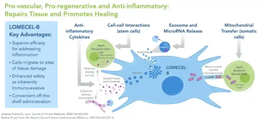 那么,如何解决这一系列问题呢?具有多效性作用机制(MOA)的多能干细胞——间充质干细胞(MSC)吸引了研究者的目光。之前的多项研究已经证明,MSC能够在细胞层面上提供全面的通讯机制,通过异细胞偶联以及释放细胞因子、生长因子和其他生物活性分子来发挥抗炎和促进血管再生的作用。
