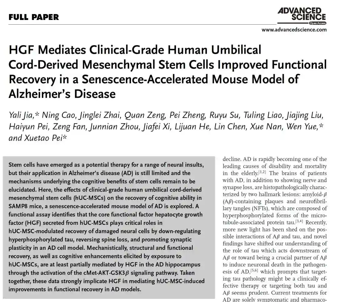这些特性使得MSC在AD治疗领域备受瞩目。2020年,AdvancedScience(影响因子:15.1)上刊登的一篇文章指出,脐带间充质干细胞具备修复受损神经细胞的能力,并能通过HGF-cMet-AKT-GSK3β通路调节tau蛋白的磷酸化,从而显著提升阿尔茨海默病模型动物的学习和记忆能力以及认知能力。这为MSC在改善阿尔茨海默症方面的应用提供了有力的临床前证据。
