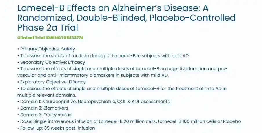 在本次研究中,科学家们测试了三种不同剂量的Lomecel-B以及安慰剂的效果,主要考察的是治疗的安全性,同时次要考察指标包括复合阿尔茨海默症评分(CADS)从研究开始到第39周的变化。此外,还探索了脑容量和认知功能等其他指标。