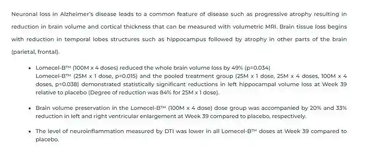 该药物的2a期CLEARMIND试验补充结果显示,细胞治疗能够显著减少患者脑部与AD相关的脑容量损失,降幅高达49%。