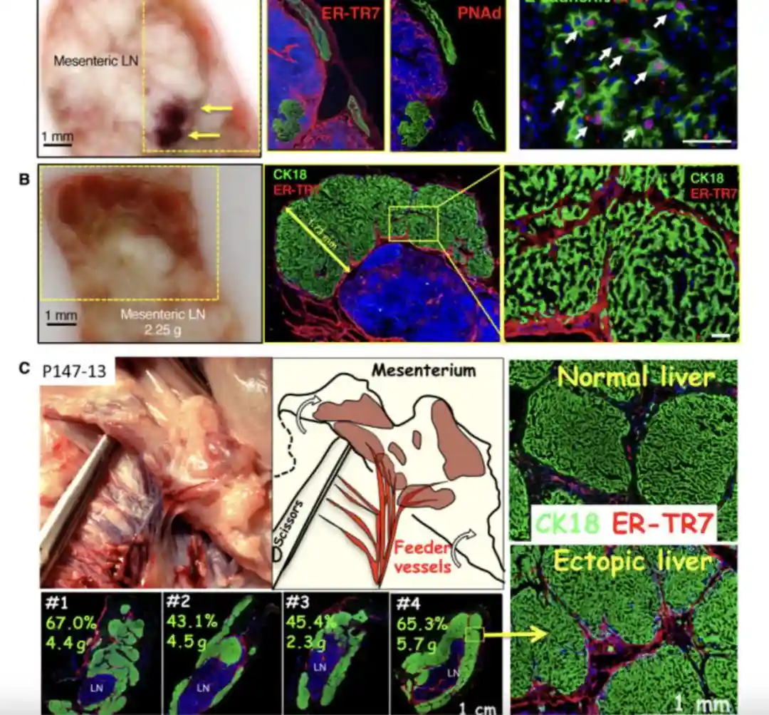 在关于猪的研究中,研究人员先诱导了猪的肝损伤,再注射剂量范围从“3.6亿个/3个淋巴结”到“18亿个/18个淋巴结”的健康肝细胞。几个月内,所有的猪都从肝损伤中恢复过来。尸检显示,淋巴结中长出了新的微型健康肝脏,每个大小约为原位肝脏的2%。