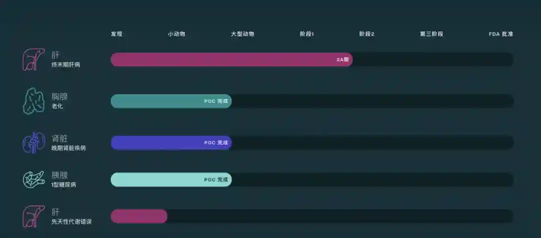 根据该公司目前的产品管线,除了肝脏,相同的技术还将其他器官细胞应用于淋巴结,以生长新的胸腺、肾脏和胰腺。