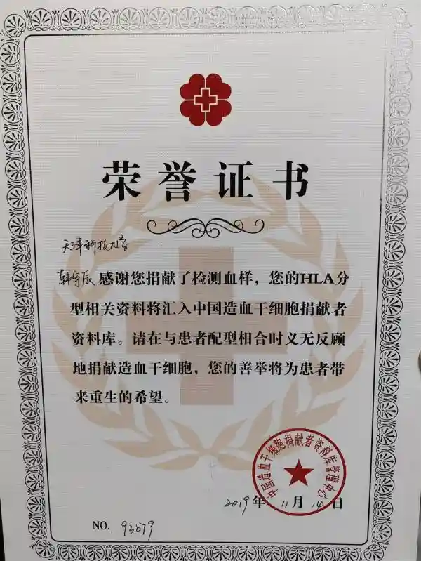 4年前,其实是一次偶然的机会,韩宇辰看到了天津科技大学红十字会宣传,便做了一回“带头大哥”,拉着他的室友们一起成为中华骨髓库志愿者。“入库的方式很简单,只需要抽一小管血就可以给患者带来一点希望,何乐而不为呢?”刚入库时,韩宇辰并没有将此事告诉自己的家人,“成功匹配的概率太低了,也不想给家人徒增担忧”。
