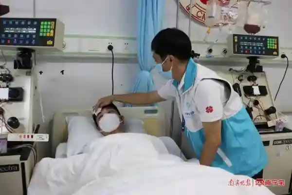 陪护志愿者为正在采集造血干细胞的唐同学擦汗