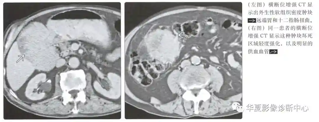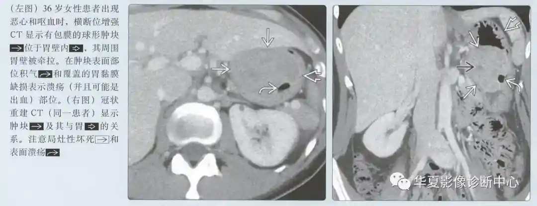 动脉期图像呈低或高血供,边界清楚的黏膜下肿块;溃疡和坏死是常见的