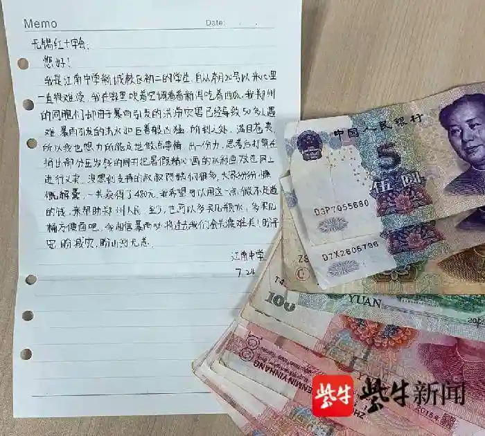 初二女生张诗晴,她看到了灾情消息,把自己的压岁钱1000元,加上水彩画放在朋友圈义卖得到的480元,一起捐出,她还专门给红十字会写了一封信说:“自从本月20日以来心里一直很难受……暴雨引发的洪水如巨兽般凶猛……所以我也想力所能及地做点事情……我希望可以用这一点微不足道的钱来帮助郑州人民……我相信暴雨必将过去,我们会共渡难关!盼平安,盼减灾,盼山河无恙!”
