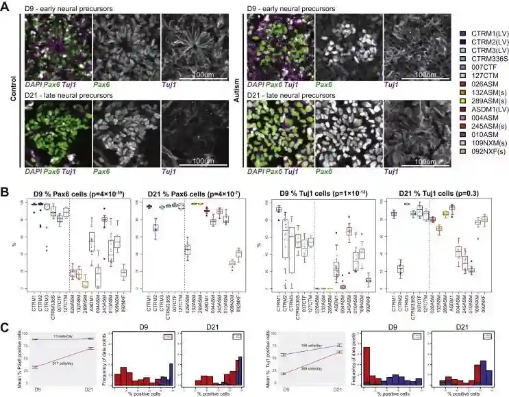自闭症iPSC衍生神经元的神经发育基因表达和神经玫瑰花环的形成从来自3个独立队列的9名自闭症患者(包括4名遗传背景不明的孤独症患者和5名高危基因位点拷贝数变异的孤独症患者)和6名典型对照者个体中产生了iPSCs。对孤独症iPSC皮质神经元进行RNA测序,发现了与死后大脑研究类似的自闭症特异性特征,这表明了潜在的共同生物学机制。
