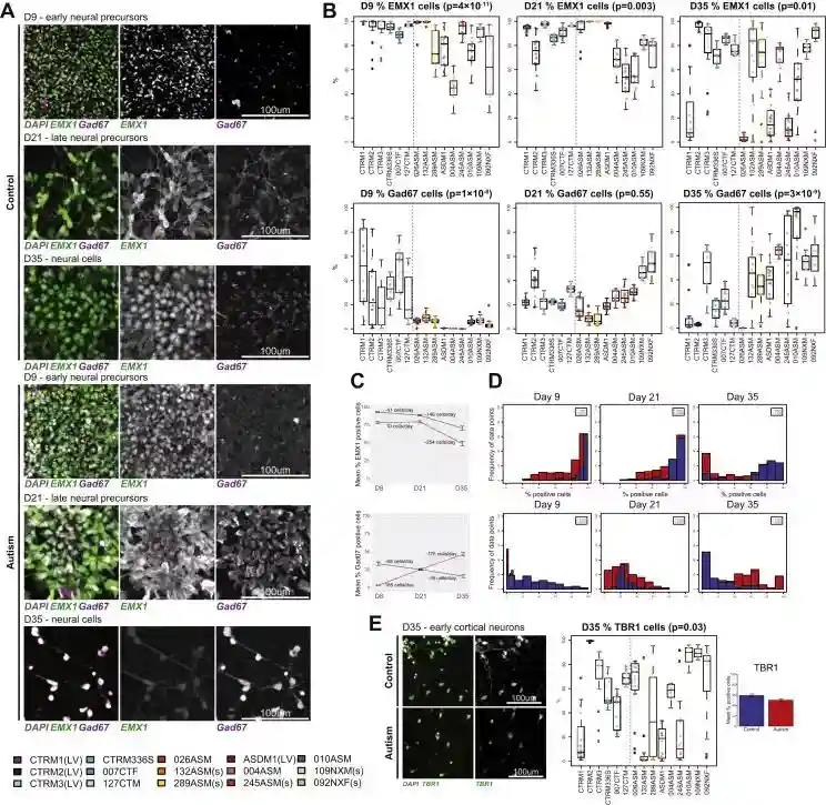 iPSC研究将GABA(γ-氨基丁酸)-谷氨酸能前体细胞和神经元功能失衡与大头畸形相关的细胞增殖表型联系在一起,DwaipayanAdhya等人也探讨了在自闭症iPSCs中是否可以观察到类似的GABA-谷氨酸能前体细胞存在的失衡。通过研究表达EMX1和GAD67的前体细胞的发育情况,前者表达于前脑背侧(谷氨酸能)神经元和前体细胞,后者是GABA合成途径中的限速酶,已知表达在GABA能细胞。
