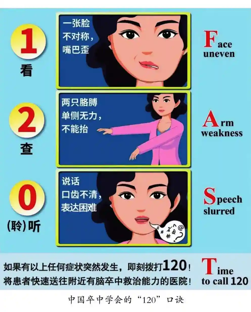 快速、准确识别脑卒中的早期症状十分必要,越早发现并及时就医治疗,患者的生存概率越大,愈后效果越好。如何快速识别脑卒中呢?中国卒中学会总结了快速识别口诀: