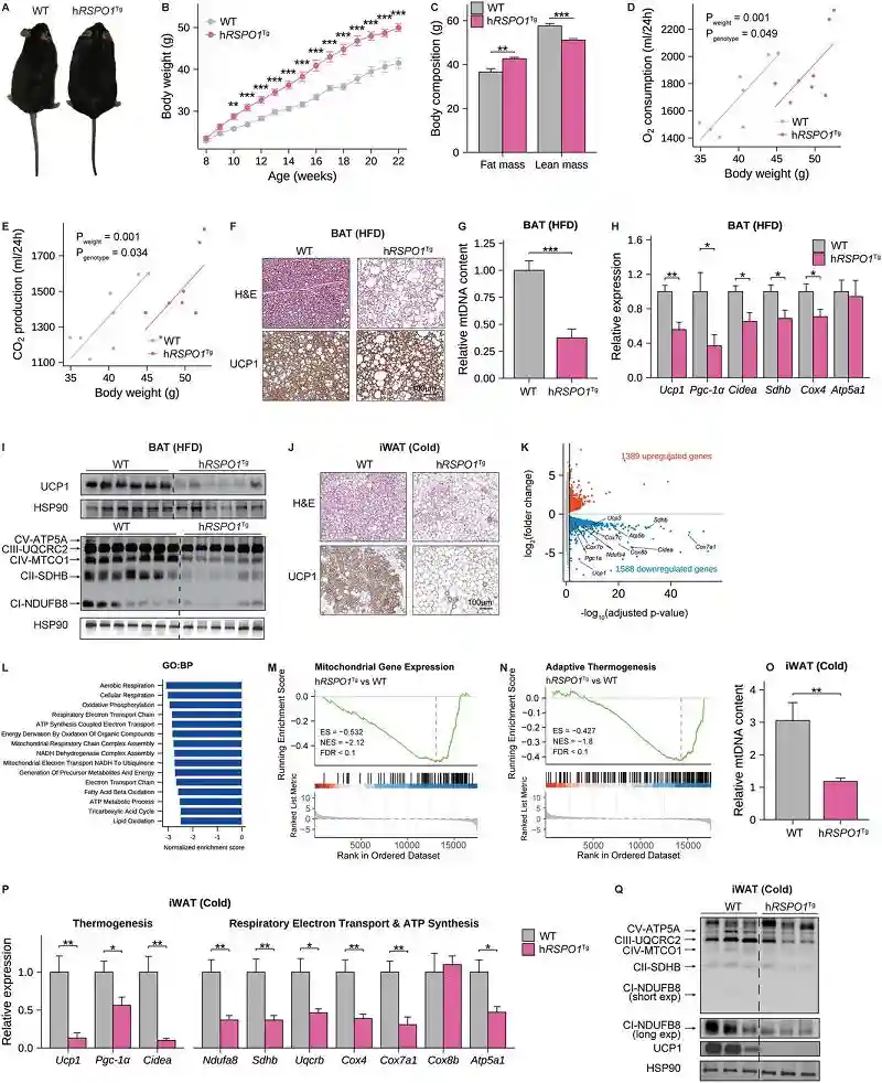 为了研究脂肪组织中RSPO1增加是否会诱导肥胖,研究人员委托赛业生物构建了一种hRSPO1转基因小鼠模型(hRSPO1Tg)。研究者发现,在以高脂饮食(HFD)喂养时,hRSPO1Tg小鼠的体重增加比野生型小鼠更多,脂肪含量更高,而O2消耗和CO2产生更低(图1),这表明人类RSPO1基因在脂肪组织中的过表达足以减少能量消耗,并促进HFD诱导的肥胖。后续分析发现,脂肪组织中过量的RSPO1表达会抑制线粒体呼吸和棕色/米色脂肪细胞的产热能力。