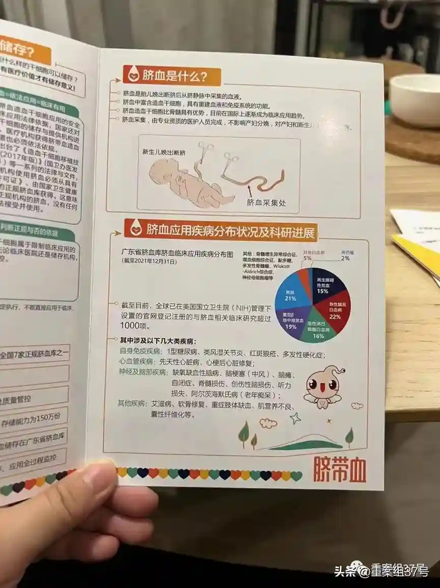 “白大褂”告诉叶秋,脐带血就是孩子出生后脐带里剩余的血,“能在关键时刻给孩子第二次生命”。对方一再提及,白血病、再生障碍性贫血、粘多糖贮积症、神经母细胞瘤等各种常见于儿童的突发疾病,可以通过脐带血得到治愈。