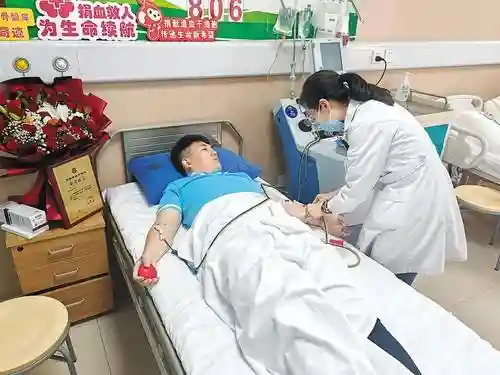 在连续打了5天动员剂之后,10月22日上午8点,李建辉终于迎来采集的重要时刻。他躺在病床上,两只手臂上各插着一根针管,连接着病床边不停运转的造血干细胞采集分离机器。血液从他的一侧手臂缓缓流出,经过分离机分离出造血干细胞后,剩下的血液再缓缓通过另一侧手臂输回体内。