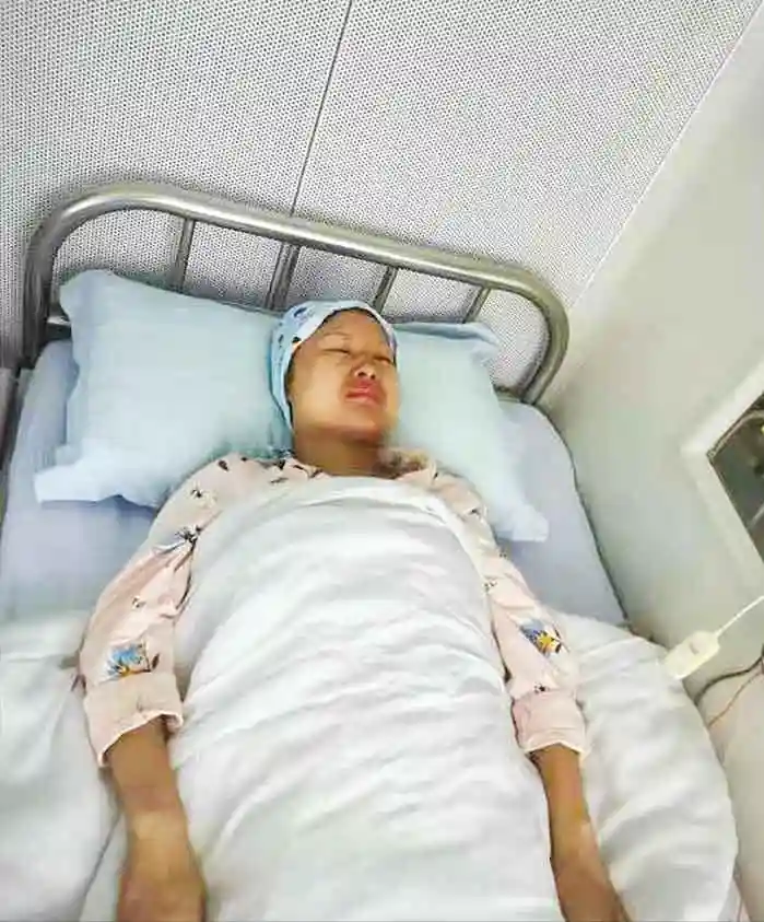 为了医治妻子的疼痛,姜铭开始带着她在州内四处求医问药,然而效果甚微。“也不知道是啥原因,当时除了身体疼痛,她头顶上还鼓了一个大包,当时也没注意,以为是自己不小心撞到了,慢慢就能恢复,可谁承想,坏就坏在这个被我们忽略的包上。”在近3个月的求医过程中,张鑫头顶的包越长越大。为了找出病因,姜铭带着妻子张鑫连夜来到了位于长春市的吉林大学第一医院,经过反复检查后,做了开颅手术取出了脑内的肿物。本以为不久就可以出院回家,可没想到却被医院告知,张鑫被确诊为“高级别双打击非霍奇金恶性淋巴瘤Ⅳ期”。