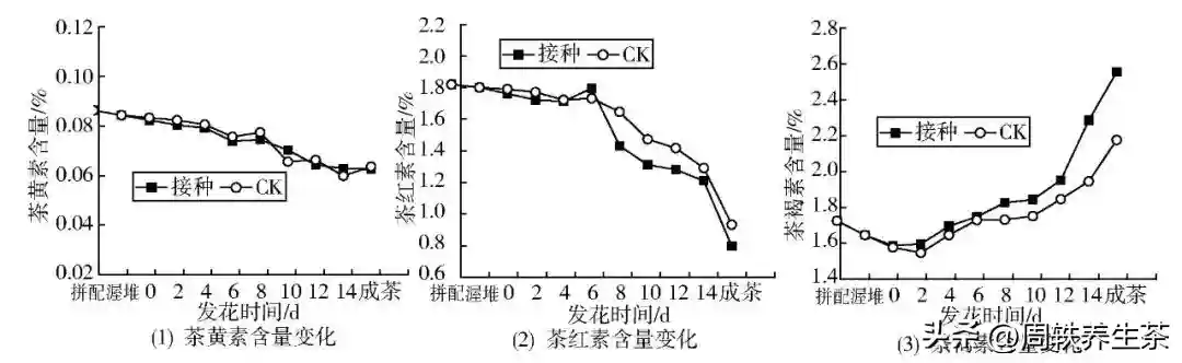 安化黑茶加工过程中,多酚含量下降,随着发酵时间的延长,酯型儿茶素和非酯型儿茶素的含量均会持续下降。安化黑茶中的酯型儿茶素在微生物酶作用下发生水解生成没食子酸和非酯型儿茶素。非酯型儿茶素进一步发生环裂解、氧化、聚合等反应,产生一系列儿茶素B环衍生物。从茯砖茶中分离出8个新的且仅在茯砖茶中出现的儿茶素B环裂变衍生物,提示其可能为茯砖茶加工过程中的特征性成分。儿茶素类化合物在加工过程会形成茶黄素、茶红素、茶褐素等。其中茶褐素是安化黑茶中最主要的茶色素,由儿茶素、茶黄素、茶红素等氧化聚合而成。茯砖茶发花过程中,从发花第四天起,茯砖茶中茶黄素和茶红素含量快速下降,茶褐素含量从第二天开始呈逐步上升趋势。