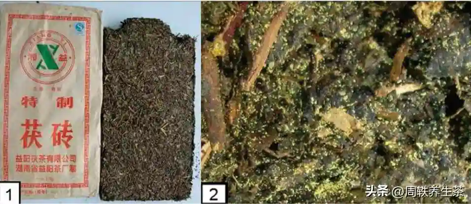 作为安化黑茶的代表,茯砖茶特殊之处在于其独有的发花工艺。发花工艺是指在一定的温湿度条件下,冠突散囊菌在茯砖茶中自发生长繁殖并成为唯一的优势真菌,最终在茯砖茶内部生成大量金黄色颗粒,俗称“金花”,即冠突曲霉菌的闭囊壳。