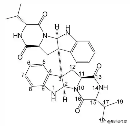 苯甲醛类化合物是冠突散囊菌的主要代谢产物。从不同品牌的茯砖茶中分离到8株不同的冠突散囊菌,且从这些菌株中分离并鉴定出了6个苯甲醛衍生物,活性研究表明,这些苯甲醛衍生物具有较好的抗炎活性,可抑制细胞中氮氧化物合成酶和环氧合酶-2的表达。从茯砖茶冠突散囊菌孢子中分离鉴定出生物碱类化合物eurocristatine。研究表明,eurocristatine可通过PI3K/AKT信号通路改善糖尿病小鼠的胰岛素抵抗,因而eurocristatine具有治疗糖尿病的潜能。