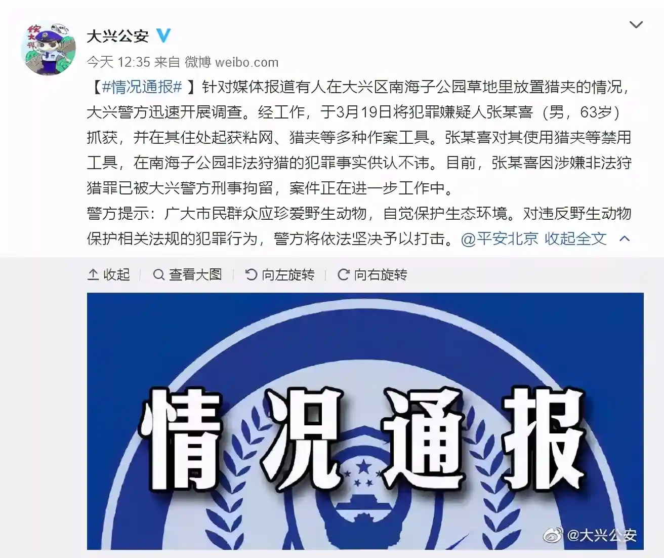 这些行为被惩处男子在公园里非法狩猎?北京大兴公安:刑拘!