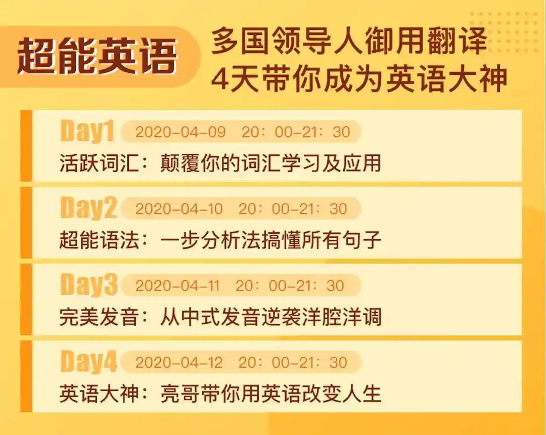 「超能英语—4天蜕变为英语大神」的4天直播课程中,萃取了能应对95%工作、生活、旅行等场合的核心内容,并教你学以致用: