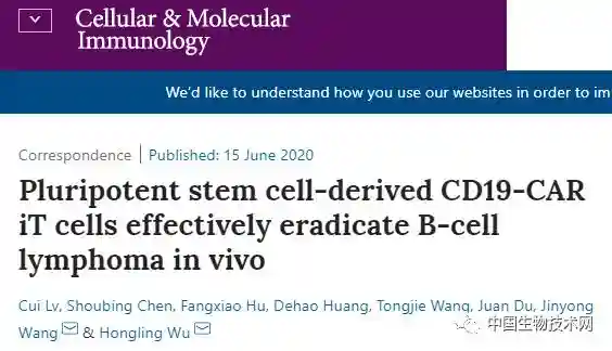 6月15日,中国科学院广州生物医药与健康研究院王金勇课题组在《细胞与分子免疫》(CellularMolecularImmunology)杂志在线发表了题为Pluripotentstemcell-derivedCD19-CARiTcellseffectivelyeradicateB-celllymphomainvivo的论文。基于课题组前期开发的“体外获得T细胞种子,体内发育成熟”两步法再生T细胞技术,该研究进一步结合嵌合抗原受体T细胞免疫疗法(CAR-T)抗肿瘤原理,通过诱导多能干细胞获得抗肿瘤特异性的CAR-T细胞,在动物模型上成功实现体内清除肿瘤。