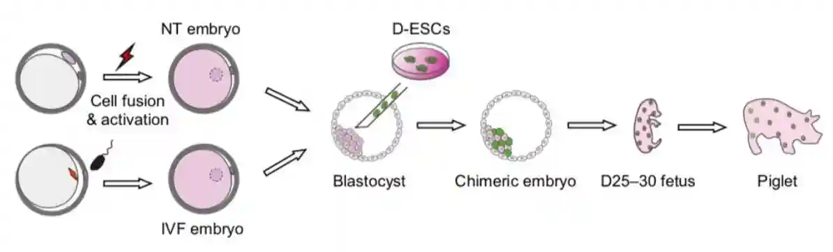 研究人员在食蟹猴细胞中加入了荧光蛋白GFP,这样就可以追踪细胞及其繁衍的后代。在得到可追踪的胚胎干细胞后,研究人员将之注射到了受精5天后的猪胚胎中。他们共注入了4359个囊胚,获得3个嵌合体胚胎。