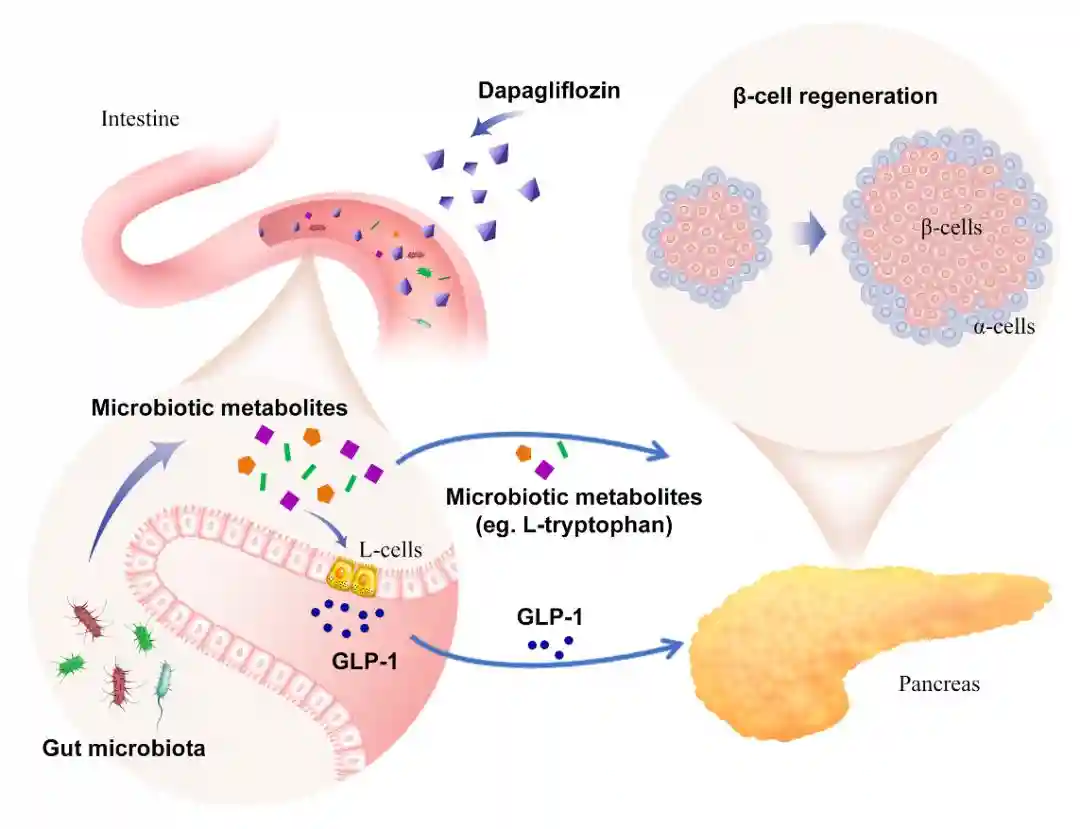 本研究揭示了SGLT2抑制剂促进胰岛β细胞再生的新机制,明确了肠道菌群-色氨酸代谢-GLP-1轴介导的肠道-胰腺对话在维持胰岛β细胞数量和功能中的重要作用,为开发药物作用新靶点、优化糖尿病治疗策略提供理论基础。